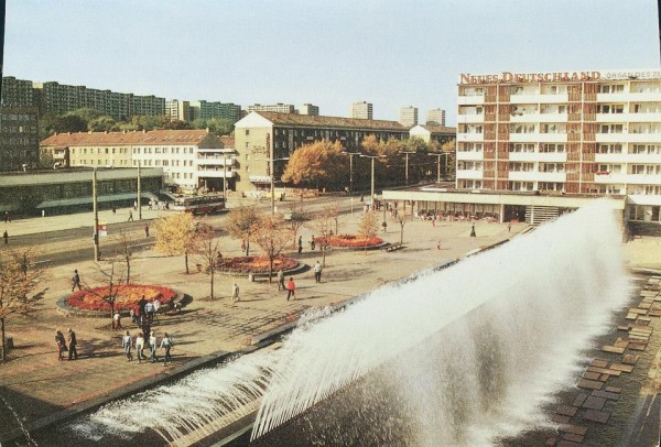Der wohl spektakulärste Brunnen befand sich auf dem Brunnenplatz. Schon der Name Brunnenplatz weist auf ein gewaltiges Wasserspiel hin. Das war es auch, denn die Betriebskosten zu DDR-Zeiten sollen sich auf etwa 550 000 Mark belaufen haben. Vor allem die Anwohner fühlten sich durch das laute Tosen der Wasserstahlen belästigt. So wurde der Brunnen in den Jahren um 1990 abgerissen. Auf vielen Postkarten aus der DDR-Zeit ist er uns erhalten geblieben. Liebevoll wird er von vielen Frankfurtern als " Fritze Krauses Panzersperre" bezeichnet. I der ehemaligen Sowjetunion gibt es ein noch gewaltigeres Vorbild dieses Brunnen. Eine Reisegruppe hat ihn damals besucht, und die Reiseleiterin machte darauf aufmerksam, dass es in der DDR in Frankfurt (Oder) einen viel viel kleineren davon gibt. Kurios war nur, dass die Reisegruppe aus besagtem Frankfurt (Oder) war. Es gab viel gelächter!!! Hier nur einige Beispiele: