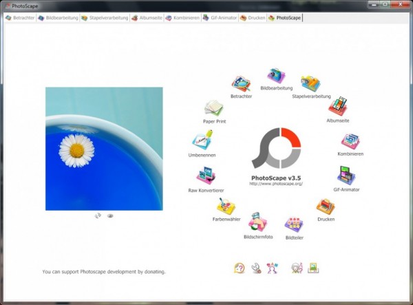 PhotoScape ist ein mächtiges Programm, welches modular aufgebaut ist. Dass heißt, es stellt auf dem Startbildschirm die einzelnen Module für die entsprechenden Arbeiten zur Auswahl zur Verfügung.