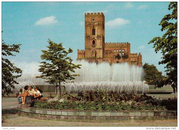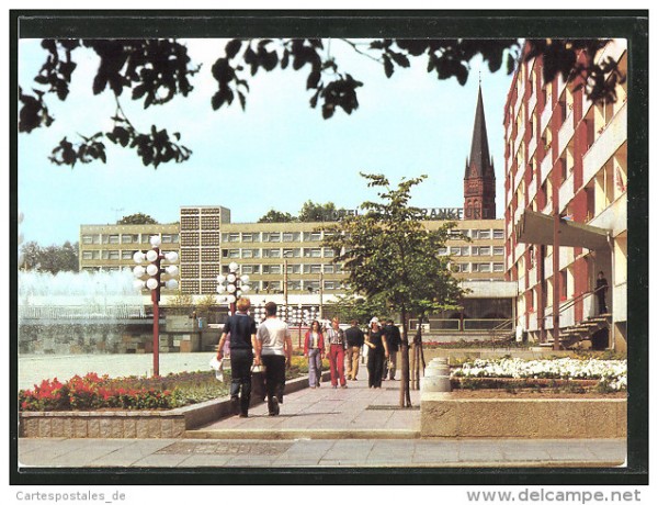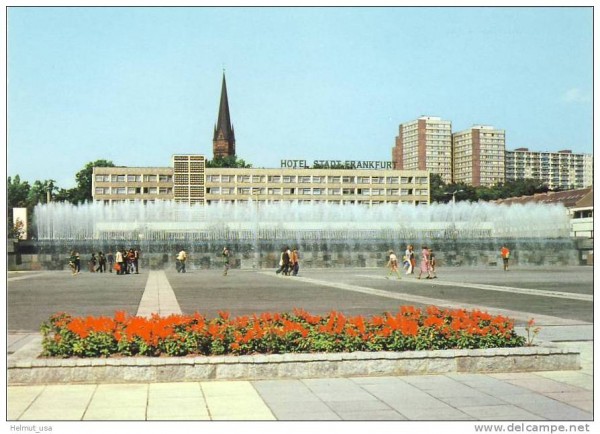 Der wohl spektakulärste Brunnen befand sich auf dem Brunnenplatz. Schon der Name Brunnenplatz weist auf ein gewaltiges Wasserspiel hin. Das war es auch, denn die Betriebskosten zu DDR-Zeiten sollen sich auf etwa 550 000 Mark belaufen haben. Vor allem die Anwohner fühlten sich durch das laute Tosen der Wasserstahlen belästigt. So wurde der Brunnen in den Jahren um 1990 abgerissen. Auf vielen Postkarten aus der DDR-Zeit ist er uns erhalten geblieben. Liebevoll wird er von vielen Frankfurtern als " Fritze Krauses Panzersperre" bezeichnet. I der ehemaligen Sowjetunion gibt es ein noch gewaltigeres Vorbild dieses Brunnen. Eine Reisegruppe hat ihn damals besucht, und die Reiseleiterin machte darauf aufmerksam, dass es in der DDR in Frankfurt (Oder) einen viel viel kleineren davon gibt. Kurios war nur, dass die Reisegruppe aus besagtem Frankfurt (Oder) war. Es gab viel gelächter!!! Hier nur einige Beispiele:
