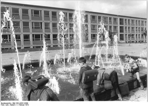 Vor der Schule, in der Nähe des Rathauses befand sich ein recht großer Brunnen. Leider ist er in der Phase der Umgestaltung des Platzes verloren gegangangen. Viele Schüler die dort eingeschult wurden und einige Jahre dort lernten, werden sich noch daran erinnern. An sonsten bleibt nur die Erinnerung an Hand von Fototgrafien oder Postkarten aus dieser Zeit. Hier einige Beispiele: